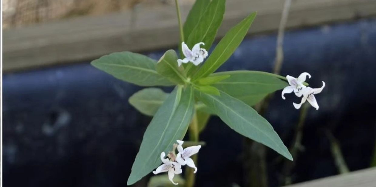 Water-willow, Justicia americana, is a common perennial along stream and lake margins. It grows to 3 feet tall and often forms dense colonies that help stabilize shorelines. The stems do not usually branch and have prominent whitish lines. Leaves are opposite, long and narrowly tapered (up to inches 6 long and ½ inch wide) with smooth margins and a distinctive whitish mid-vein, looking much like those of the willow tree.